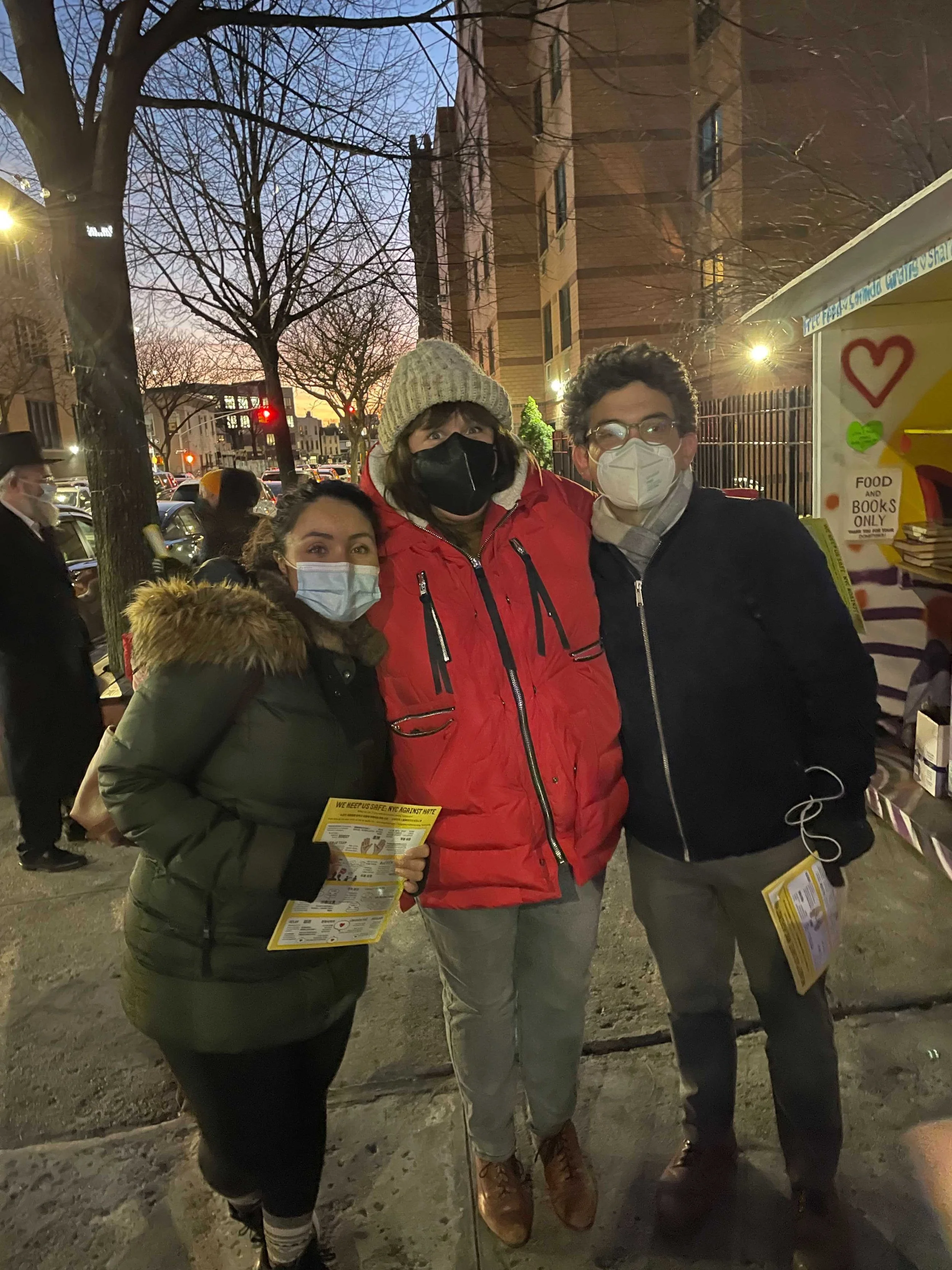 La concejal Jennifer Gutiérrez, la asambleísta Emily Gallagher y Lincoln antes de iniciar una petición contra el antisemitismo en Williamsburg.